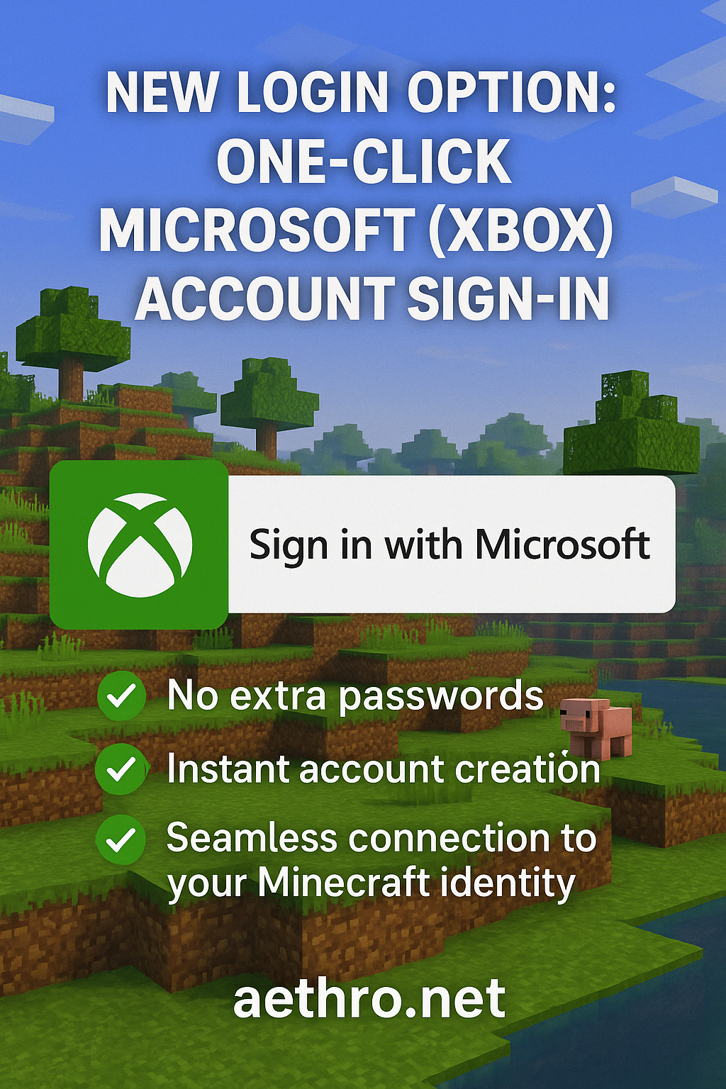 We’ve made it even easier to join the Aethro community. You can now sign in or register using your Microsoft (Xbox) account — no forms, no hassle. That means if you play Minecraft with a Microsoft account, you’re just one click away from joining. Log in, link up, and you’re ready to explore. ✅ No extra passwords ✅ Instant account creation ✅ Seamless connection to your Minecraft identity Try it now and get into the game faster: https://aethro.net