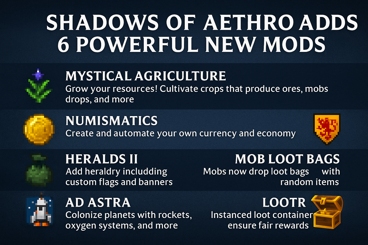 The Shadows of Aethro Forge server just got a serious upgrade with six new mods from CurseForge, unlocking new mechanics, deeper progression, and full-blown space travel. Plus — the world border has been expanded so fresh terrain can generate, giving you full access to all the new content. Here’s what’s new: 🔮 Mystical Agriculture Grow anything: ores, mob drops, gear materials. It’s farming on steroids. 🪙 Create: Numismatics Mint your own money with automated coin crafting. Trade systems? Now possible. 🏰 Heralds II (Heralds: Legion) Custom banners and heraldry to give your colony its own identity. 🎁 Mob Loot Bags Mobs now drop random loot bags. PvE just got more chaotic and rewarding. 🪐 Ad Astra Rocket tech, oxygen systems, and planetary exploration — the entire solar system is now in play. 📦 Lootr Dungeon loot is now instanced per player. No more “first come, first steal.” 🌍 World Border ExpansionWe’ve officially expanded the world border to open up new terrain generation. This means: New structures can spawn New ores and crops can generate naturally Exploration just got way more rewarding 🧭 Update your modpack now to access everything: 🔗 https://l.aethro.net/forge-pack